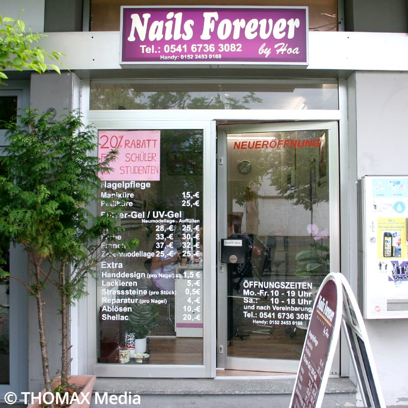 Willkommen im Nails Forever Nagelstudio! Wir sind ein professionelles Nagelstudio, das sich auf die Kunst des Nagelstyling spezialisiert hat. Unser Team besteht aus erfahrenen Nageldesignern, die Ihnen helfen, Ihren Look zu vervollständigen. Wir bieten eine breite Palette an Nagelpflege- und Design-Services, einschließlich Maniküre, Pediküre, Gel- und Acrylnägel, Nagelverlängerungen, Nagelkunst und vielem mehr. Unser Ziel ist es, Ihnen ein unvergessliches Erlebnis zu bieten, bei dem Sie sich wohl und geschätzt fühlen. Wir verwenden nur die besten Produkte und Techniken, um sicherzustellen, dass Sie mit Ihrem Look zufrieden sind. Wir freuen uns Sie zu sehen!